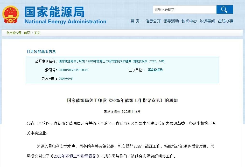 為深入貫徹落實(shí)黨中央、國務(wù)院有關(guān)決策部署,以更高標準踐行能源安全新戰略,扎實(shí)做好2025年能源工作,以能源高質(zhì)量發(fā)展和高水平安全助力我國經(jīng)濟持續回升向好,近日,國家能源局發(fā)布了《2025年能源工作指導意見(jiàn)》