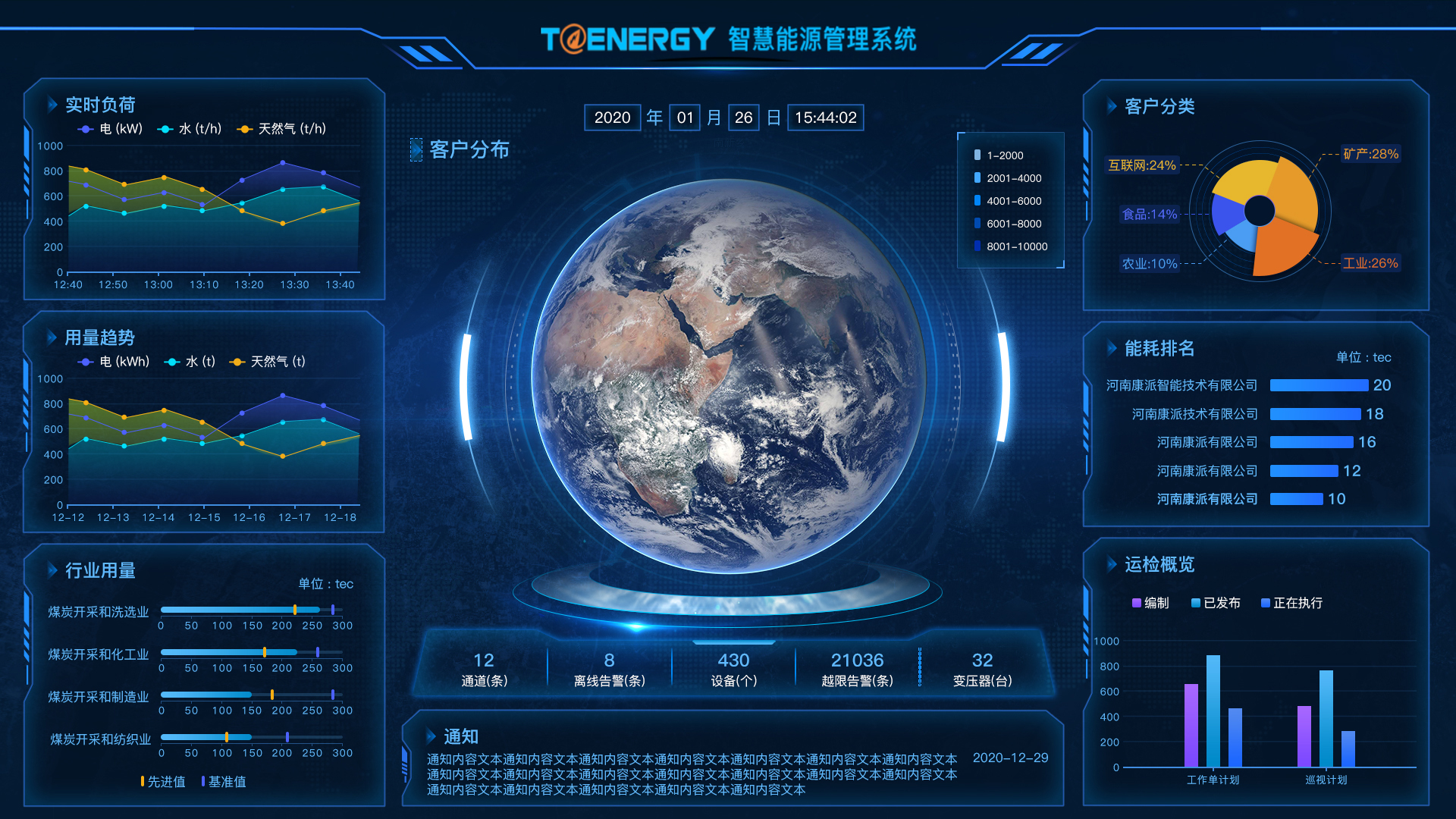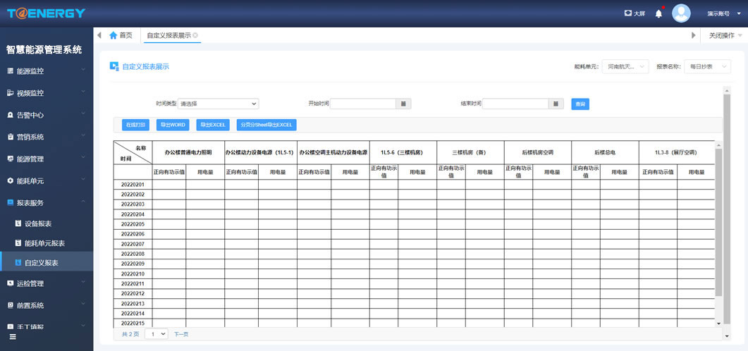 查看主要用能單元、用能設備的能耗值,提供同比、環(huán)比分析、能耗對比分析、能耗預測等功能,提高用戶(hù)用能管理水平。